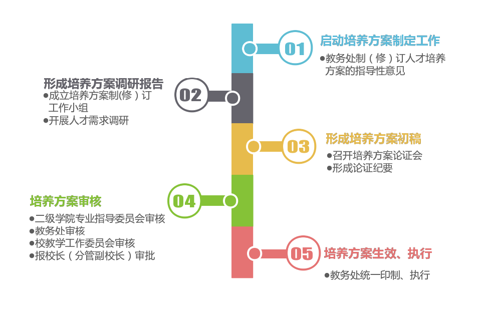 教务处起草人才培养方案制订的指导意见, 经教务处处长和分管校长审核通过后发文至各二级学院。各二级学院应当根据本意见要求,统筹规划,制定专业人才培养方案制(修)订的具体工作方案,成立由行业企业专家、教科研人员、一线教师和学生(毕业生)代表组成的培养方案制定工作小组,共同做好专业人才培养方案制(修)订工作。