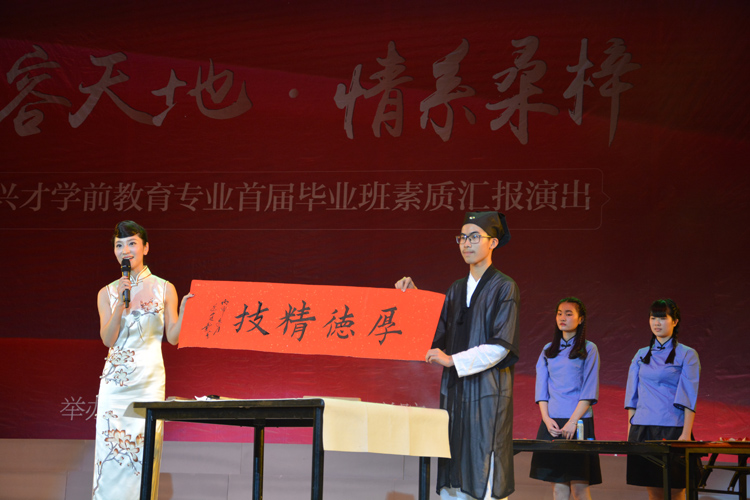2016年11月25日下午,“德容天下 情系桑梓——厦门兴才学院学前教育专业首届毕业班素质汇报演出”在集美大学诚毅学院影剧院盛大开幕。 “勤业勤职勤公勤奉献,从来勤为天性;爱国爱校爱生爱教育,总之爱是源泉”,厦门兴才学院学前教育专业秉承我校“以德为先,以生为本,特色兴校,质量强校”的办学理念,在教育教学过程中深化特色品牌专业建设,以国学礼仪来塑造师德修养,来打造特色幼教专业人才。 此次汇报演出,以“礼”为灵魂,以“国学”为主线,贯穿演出始终,在一首《礼》的歌曲演唱中拉开了序幕。演出现场,学生闪亮登场,气势宏大,节目令人大开眼界。学校领导对此给予了高度评价,对同学们的节目赞不绝口,每一个作品都融入了指导老师和同学们的心血。 舞蹈《水墨畅想》、《弟子规》、《茉莉情怀》、《游子吟》、《太行茉莉》、《民族一家亲》等节目,吸引了观众的眼球,学生的表演,即体现了“以国学礼仪教育来打造特色幼教专业人才”的培养理念,又充分展示了我校幼教专业学生扎实的舞蹈技能;教育学院倡导的国学礼仪教育,不仅有国学经典的文化渗透,还有国学武风的威武气概,武术操《国学武风》,就体现了巾帼英雄的威武气概;坚守一份恬淡,奉献爱心千片,任凭岁月更迭,我们尽情驰骋在人民教师的舞台上,造就一代代天之骄子。教育兴,则民族兴。我很骄傲,我是光荣的人民教师。诗歌朗诵《我骄傲,我是一名幼儿教师》,恰恰反映了这个主题;童话剧《灰姑娘》,梦中的水晶鞋,南瓜车还有英俊的王子,善良美丽的灰姑娘,勾起了我们多少童年的回忆;才艺秀展示了古筝、茶艺、书法和剪纸艺术,体现了传统艺术与现代元素的巧妙融合,使我们体味到中国传统艺术文化的魅力;歌曲联唱,充满着青春的激情与活力,将现场气氛推向了高潮;华美的文字表达不尽我们对老师的感恩之情,深情的歌声在倾诉着桃李情深,在一首由14级幼教学生合唱的《老师,我想你》歌声中,演出圆满结束。
