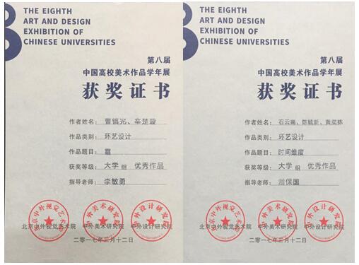 在刚刚结束的第八届中国高校美术作品学年展中,我校艺术与建筑学院学子共计荣获一个二等奖,一个三等奖及一个优秀奖的好成绩。 本届高校美术作品学年展共计收到来自全国千余所高校的有效稿件8962件,其中美术造型类作品3169件,美术设计类作品5793件。展览评选遵循“广泛掇英,宁缺毋滥”的原则,最终评出:美术造型类获奖作品193件,美术设计类获奖作品323件,获奖率约为6%。获奖作品充分代表了当前高校美术与设计创作的最高水准,堪称全国高等院校美术与设计界的国展、国赛。 据悉,我校建筑室内设计教研室自2016年推行工作室化教学以来,以职业技能培养为主导,以实际工作过程为指导,以就业需求岗位为标准,以虚拟和真实的项目为载体,培养学生的职业素质,专业知识,技术技能,采取“实战实练、项赛结合”的工作室化教学模式,营造真实的职场氛围,培养学生的岗位工作能力,落地项目得到业主及内业的多次认可。
